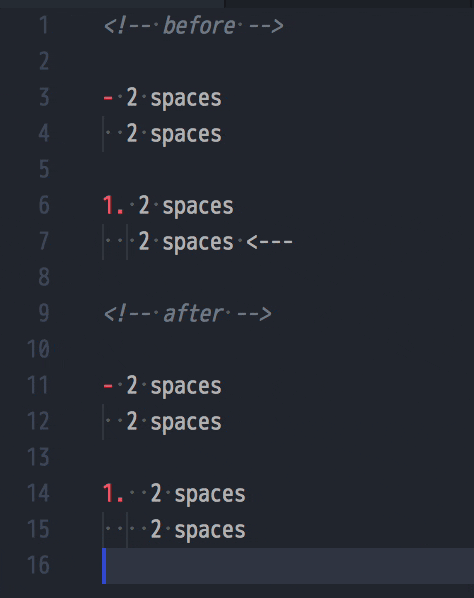 Hemos descubierto que CommonMark difiere de la sintaxis Markdown original para bloques de código en elementos de lista. Esto lleva a escenarios donde bloques de código sangrados en Markdown se representaban como párrafos regulares. Este cambio usa la opción tabWidth para determinar cuánta sangría usar en elementos de lista. Lea #3459 si está interesado en los detalles.